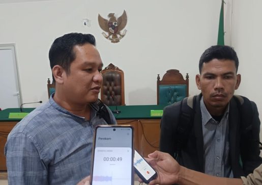 DIWAWANCARAI—Pengacara Turiman, SH, MH didampingi Eduward Sagala, SH, saat diwawancarai wartawan usai persidangan di PN Palembang, Selasa (10/3/2026).
