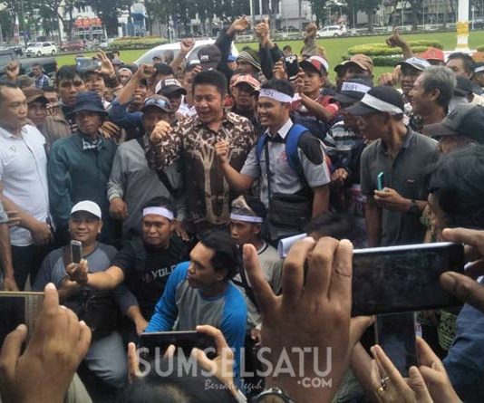 Puluhan massa yang tergabung dalam Gerakan Tani Sumsel dan Serikat Buruh PTPN VII melakukan aksi demo di Kantor Pemprov Sumsel, Kamis (21/3/2019). Massa menuntut Gubernur Herman Deru menuntaskan masalah sengketa lahan mereka dengan PTPN VII Cinta Manis di Kabupaten Ogan Ilir.