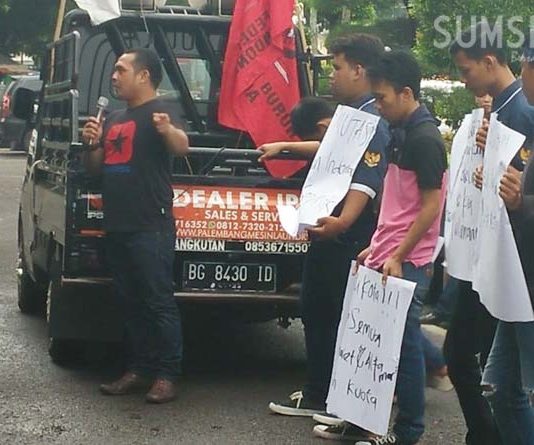 Komite Aksi Untuk Kedaulatan Rakyat Palembang (KAUKRP) kembali menggelar aksi di Kantor Pemko Palembang, Jumat (21/12/2018). Mereka kembali beraksi karena sampai saat ini belum ada tindakan tegas Walikota Palembang untuk membongkar Hotel Ibis yang tidak memiliki IMB serta menutup PTC Mall.
