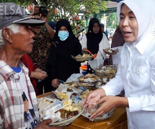 Aksi inspiratif, Wakil Walikota (Wawako) Palembang Fitrianti Agustinda mengukir senyum penuh kegembiraan di wajah para kaum dhuafa dan fakir miskin dengan membagikan 500 porsi makan siang, Jumat (26/10/2018), di pelataran Monpera.