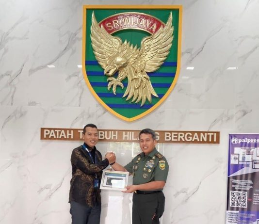 Pemimpin Wilayah III PT Pegadaian Palembang Pratikno, menawarkan program Rencana Emas melalui aplikasi Pegadaian Digital System (PDS) kepada Panglima Kodam (Pangdam) II Sriwijaya Mayjen TNI Hilman Hadi, SIP, MBA, MHan.