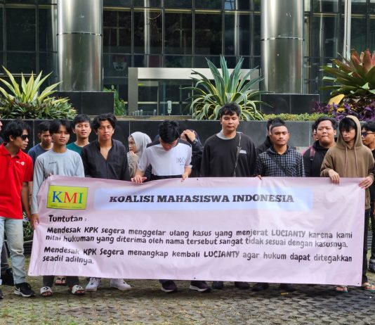 Puluhan mahasiswa yang tergabung dalam Koalisi Mahasiswa Indonesia (KMI) mendatangi Gedung Komisi Pemberantasan Korupsi (KPK) di Jakarta Selatan, Jumat, (17/5/2024) siang.