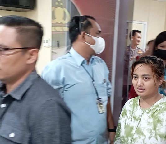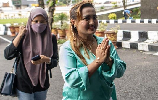Selebgram Lina Lutfiawati atau Lina Mukherjee memenuhi panggilan penyidik Direktorat Reserse Kriminal Khusus (Ditreskrimsus) Polda Sumatera Selatan (Sumsel) usai ditetapkan sebagai tersangka kasus dugaan penistaan agama terkait konten makan babi sambil membaca Bismillah, Rabu (3/5/2023).