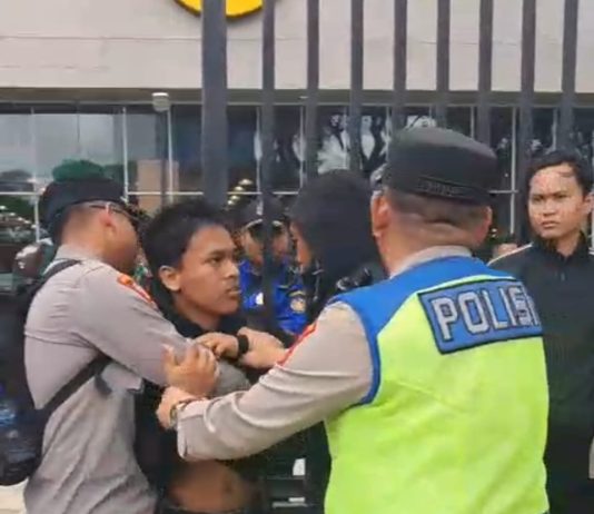 Tampak pemuda yang mengenakan hoodie hitam dan celana hitam diamankan tiga orang anggota polisi dan membawanya keluar dari rombongan mahasiswa, kemudian memasukkannya ke dalam pagar mal Palembang...