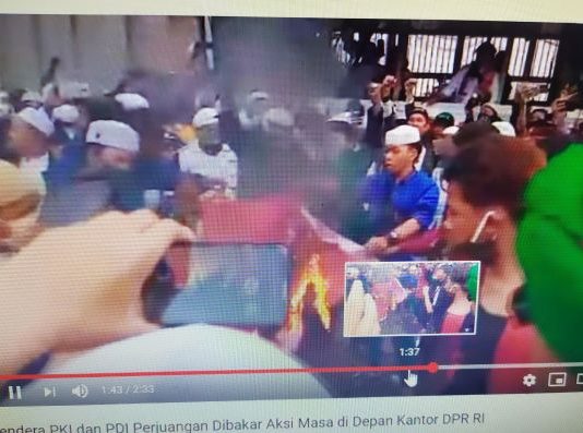 Pembakaran bendera PDI Perjuangan itu terjadi pada unjukrasa di depan gedung Dewan Perwakilan Rakyat (DPR) RI, Senayan, Jakarta Selatan, Rabu (24/6/2020). Unjukrasa yang dilakukan beberapa organisasi kemasyrakatan...