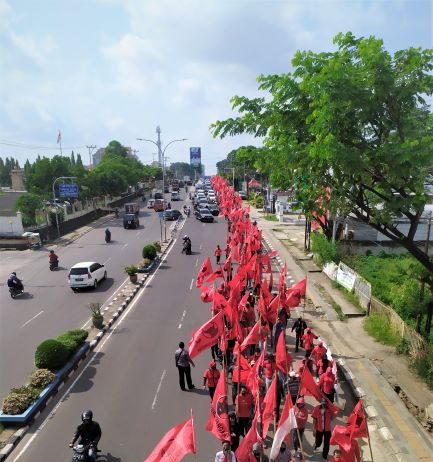 Ratusan massa Partai Demokrasi Indonesia (PDI) Perjuangan di Kota Palembang, Senin (29/6/2020), turun ke jalan. Sejak sekitar Pukul 08:00, massa berdatangan ke Stadion Kamboja, Palembang.