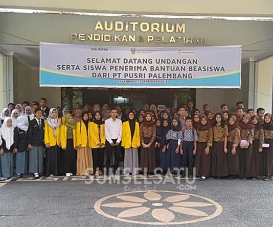 Manajer PKBL PT Pusri Palembang Heri Suharsono dalam acara PT Pusri Palembang Peduli Pendidikan menyerahkan bantuan beasiswa.