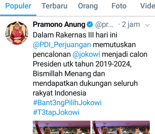 “Dalam Rakernas III hari ini @PDI_Perjuangan memutuskan pencalonan @jokowi menjadi calon Presiden utk tahun 2019-2024, Bismillah Menang dan mendapatkan dukungan seluruh rakyat Indonesia #Bant3ngPilihJokowi #T3tapJokowi,” demikian ditulis Pramono Anung di akun Twitter-nya, Jumat (23/2/2018).