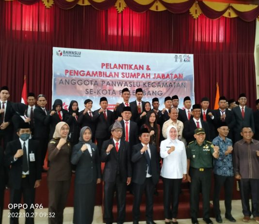 Sebanyak 54 orang anggota Pengawas Pemilihan Umum (Panwaslu) Kota Palembang dilantik oleh Badan Pengawas Pemilihan Umum (Bawaslu) Kota Palembang di Griya Stihpada Palembang, Kamis (27/10/2022).