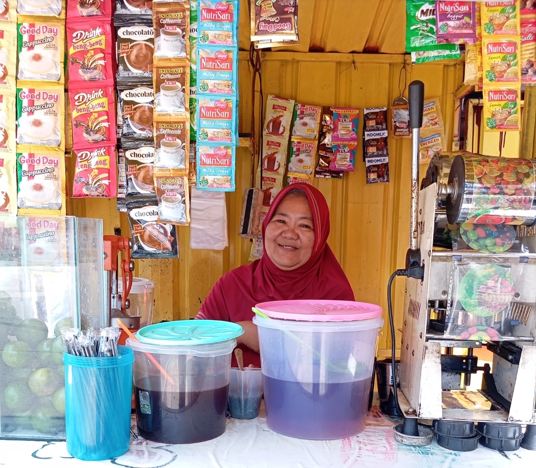 “Saya jual minuman yang beragam agar pembeli memiliki banyak pilihan, harganya pun ramah di kantong,” ujar Siti berpromosi.