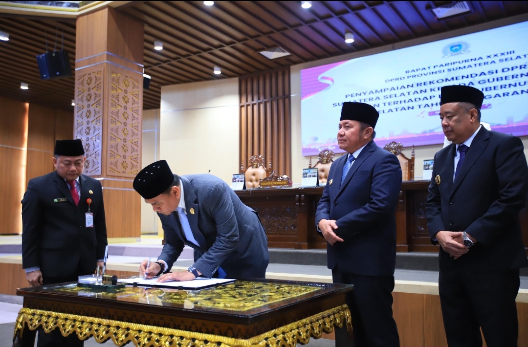 Gubernur Sumatera Selatan Dr H Herman Deru dalam sambutannya menegaskan komitmennya untuk menindaklanjuti seluruh rekomendasi yang disampaikan DPRD.