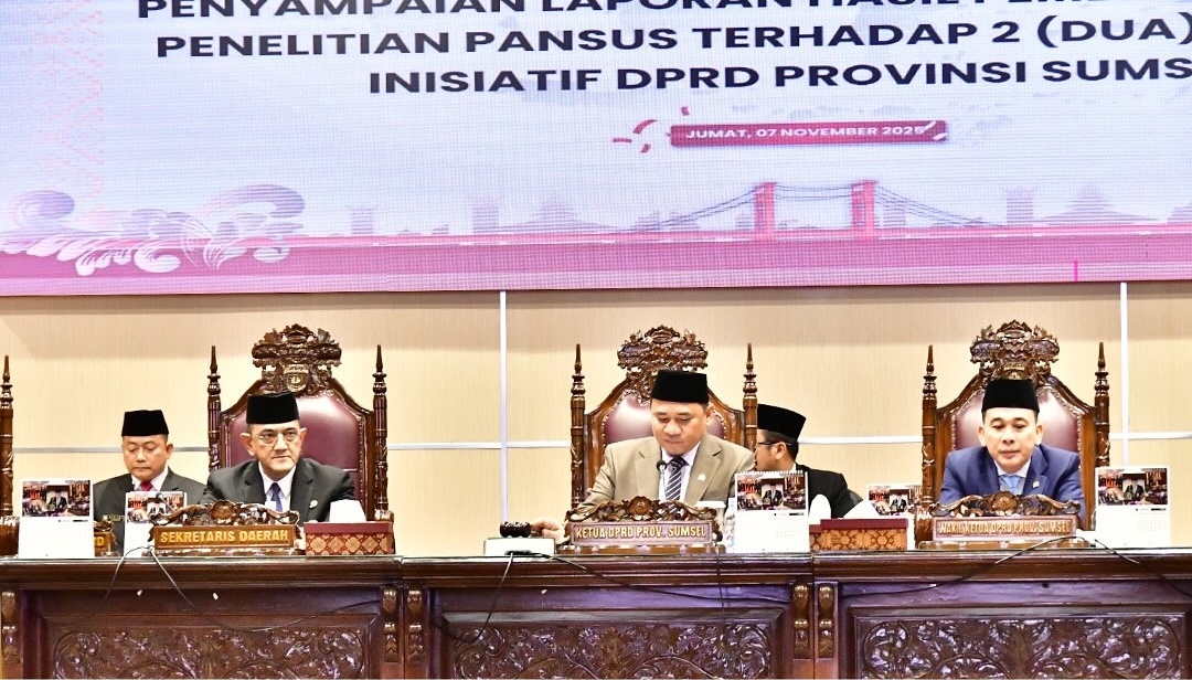 DPRD Provinsi Sumatera Selatan (Sumsel) menggelar rapat paripurna dengan agenda penyampaian laporan hasil pembahasan dua Rancangan Peraturan Daerah (Raperda) Inisiatif DPRD Sumsel, yaitu Raperda tentang Kesejahteraan Lanjut Usia dan Raperda tentang Pembinaan Ideologi Pancasila dan Wawasan Kebangsaan, Jumat (7/11/2025).