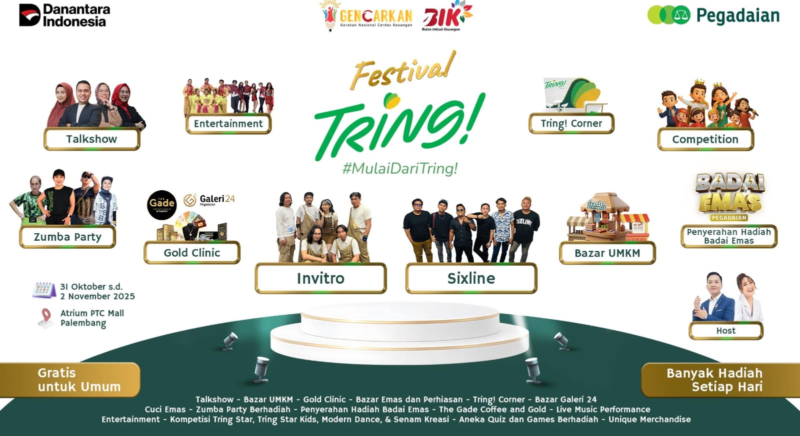 Festival Tring! by Pegadaian bukan hanya tentang bertransaksi, tetapi juga merayakan masa depan finansial yang lebih cerah dan menyenangkan. Cek lokasi dan jadwal artis favorit Anda di: https://sahabat.pegadaian.co.id/acara/festival-tring-2025.