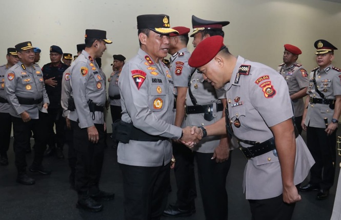 BERSALAMAN—-Kapolda Sumsel Andi Rian R Djajadi bersalaman dengan pejabat Polda Sumsel pada acara Sertijab di Mapolda Sumsel, Palembang.