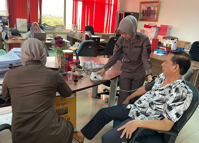 TEKANAN DARAH----Petugas Kejati Sumsel saat melakukan pemeriksaan tekanan darah tersangka Dasril. (FOTO: IST/DOK.PENKUM KEJATI SUMSEL)