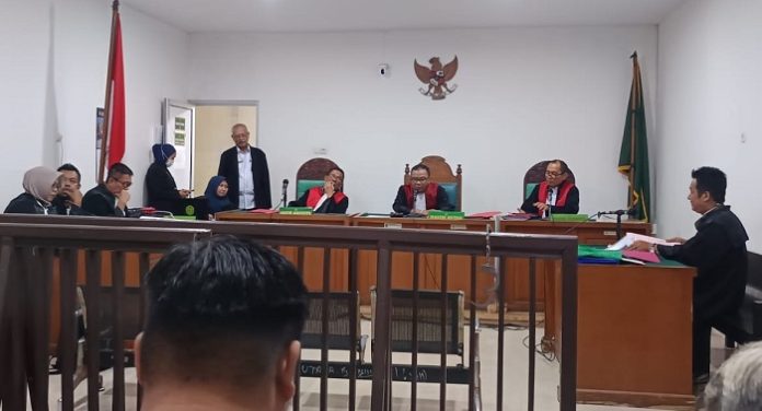 Putusan Majelis Hakim Pengadilan Negeri (PN) Palembang atas perkara Eko Sempurna dibacakan di ruang sidang PN Palembang di gedung Museum Tekstil Sumsel, Palembang, Senin (27/4/2026). Terdakwa tidak hadir secara langsung ke ruangan sidang, melainkan melalui video sambungan internet. Pengacara A Rizal, SH, dari Posbakum PN Palembang yang mendampingi terdakwa hadir di ruangan sidang.