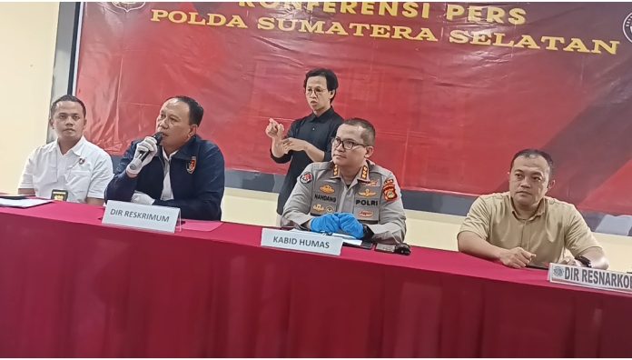 KONFERENSI PERS----KONFERENSI PERS---- Direktur Ditreskrimum Polda Sumsel Kombespol Johannes Bangun didampingi Kabidhumas Polda Sumsel Kombespol Nandang Mu’min Wijaya, SIK, MH, Kasatreskrim Polrestabes Palembang AKBP Andrie Setiawan dan Direktur Ditresnarkoba Polda Sumsel Kombespol Yulian Perdana saat konferensi pers di Mapolda Sumsel, Palembang, Rabu (3/9/2025). (FOTO : SS1/ANTON R FADLI)