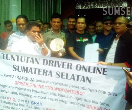 Puluhan orang yang tergabung dalam Asosiasi Driver Online (ADO) melakukan aksi di depan Kantor PT Gojek Indonesia (GI) di Jalan Basuki Rahmat, Kamis (23/3/2018). Dalam aksi tersebut ADO mengajukan tiga tuntutan.