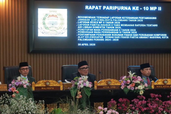 Walikota Palembang Ratu Dewa, menghadiri Rapat Paripurna X Masa Persidangan II DPRD Kota Palembang, Kamis (30/4/2026). Agenda utama rapat ini adalah penyampaian rekomendasi DPRD terhadap Laporan Keterangan Pertanggungjawaban (LKPJ) Walikota Tahun Anggaran 2025.